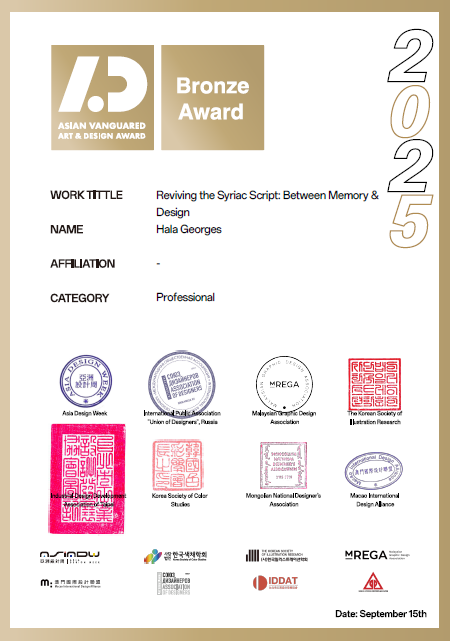 This body of work investigates the contemporary reinterpretation of the Syriac script through typographic design, editorial publications, and experimental visual dissemination. The project examines how an ancient writing system—historically subject to marginalisation and erasure—can be re-activated within contemporary design practice while retaining its structural integrity, cultural specificity, and political resonance. The research operates across analogue and digital outcomes. Script-based investigations were translated into folded A3 editorial publications, conceived as self-contained research artefacts that function independently from the classroom, exhibition space, or screen. Editorial sequencing, folding, scale, and materiality were used as methodological tools, positioning typography simultaneously as research content and research method. The publications were designed to circulate, be handled, and be encountered beyond formal institutional contexts, reinforcing typography as a mobile and distributable research output. Alongside analogue publications, selected graphic works were extended through AI-assisted visualisation to explore how typographic forms might operate at architectural and urban scales. In this context, AI was used strictly as a visualisation tool to simulate spatial and material installations—not as a generative design author. These visualisations enabled speculative engagement with public space, allowing the typographic statements—addressing themes of memory, resistance, knowledge, strength, and collective identity—to be imagined beyond the page as large-scale, public interventions. The project was disseminated internationally through Asia Design Week (October 2025) and exhibited across multiple academic institutions in Asia, including: -University of Macau (China) -University Malaya and Sunway University (Malaysia) -Hebei Academy of Fine Arts, Jingdezhen Ceramic University -Hubei University of Technology, and Beijing Forestry University (China) -Burapha University (Thailand). This multi-site exhibition framework positioned the work within a transnational academic and design discourse, extending its reach beyond a single institutional or geographic context. The project received the Bronze Award in the Professional Category at the Asian Vanguard Art & Design Award 2025, recognising its contribution to contemporary typographic research, cultural preservation through design, and critical engagement with script as a form of visual knowledge. Frascati Criteria Alignment This research satisfies the Frascati definition of research activity as follows: (i) Novel — It advances original methods for translating Syriac script into contemporary typographic and editorial forms. (ii) Creative — It employs experimental design strategies across print, spatial visualisation, and material thinking. (iii) Uncertain in outcome — The research outcomes were not predetermined, emerging through iterative visual and material experimentation. (iv) Systematic — The project followed a structured process of historical analysis, typographic development, editorial design, and dissemination. (v) Transferable / Reproducible — The methods and frameworks developed are applicable to other script-based, culturally situated design research contexts.